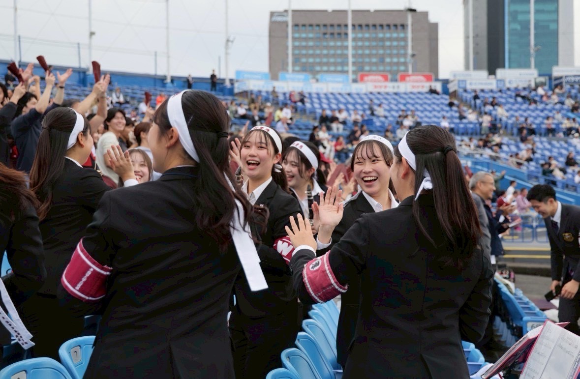 吹奏楽は1人では成り立ちません。仲間がいるからこそ、素敵な音楽を奏でる事ができます🎺仲間と1つの音楽を作る過程で、互いの技術を高め合いながら、個々の音色を尊重する事はとても楽しいです。特に、応援部吹奏楽団には様々なバックグラウンドを持った人がいるので、互いの良さを認め合いながら切磋琢磨出来るのが良い所だと思います👍🏻これは座奏だけでなく、ドリルも同じです。誰1人欠けることなく、1つのステージを完成させる事ができた時の達成感は堪りません😍私自身大学生からカラーガードを初め、最初は上達しない悔しさを感じる事が多くありました。しかし、周りの人達のサポートのお陰で、少しずつ成長する事ができ、本番のステージを楽しむ事が出来るようになりました!!音楽には正解がないからこそ、自分たちの納得がいくまで練習を続け、心に響く演奏や演技を追求する事ができます。その時間は私にとって何よりも楽しい時間です🎶
